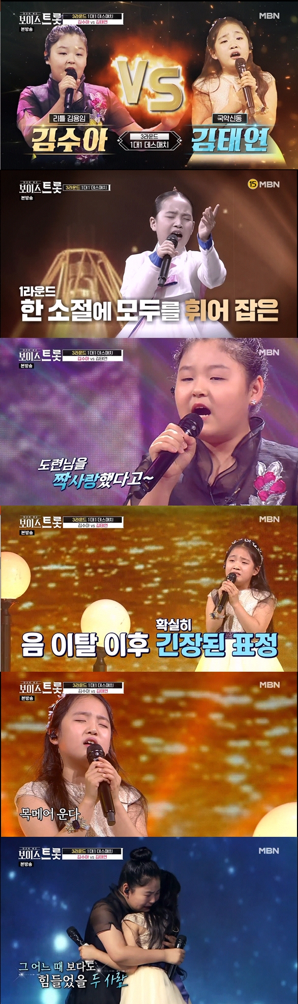 김태연은 무대가 끝난 뒤 목이 매어 눈물을 흘렸습니다.김수아도 옆에서 "태연이가 연습을 많이 해서 노래 부르다가 안 좋아져서 속상했다"며 함께 눈물을 흘렸습니다.