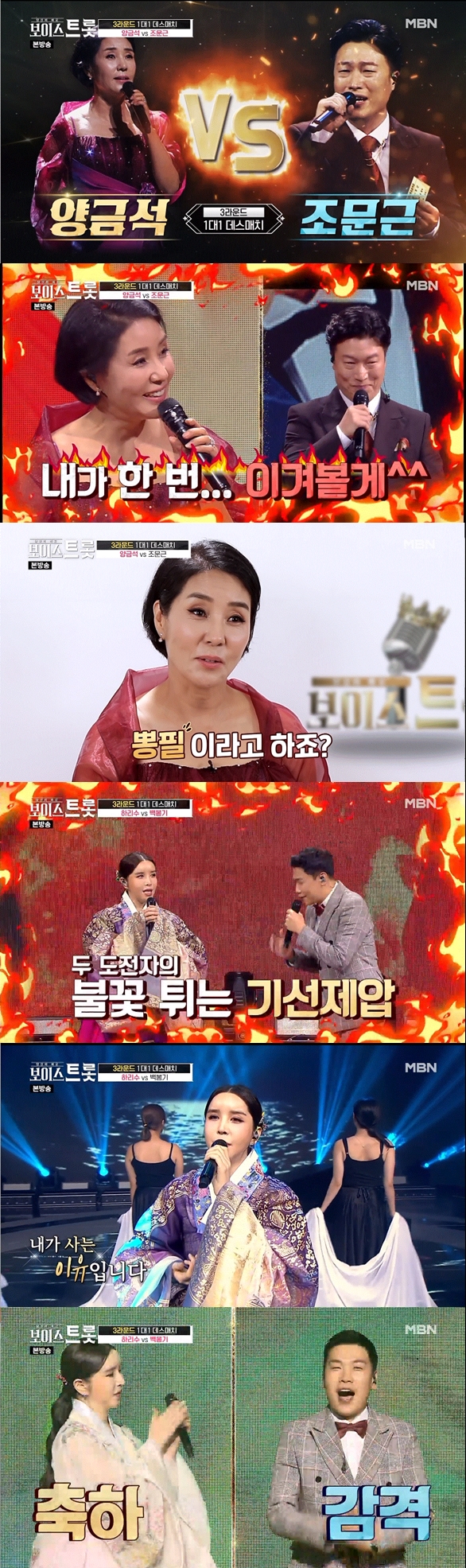 양문석-조문근, 하리수-백봉기, 김수아-김태연, 선율-하현곤 등이 대결했습니다.출연자들의 기대를 모은 매치는 양금석과 조문근의 '명품 보이스' 대결이었습니다.