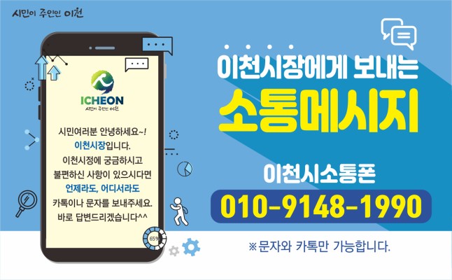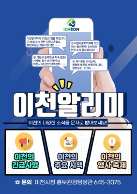 이천시(시장 엄태준)는 문화, 교육, 행정 등 시민들에게 필요한 주요소식을 휴대폰 알림톡(문자)로 발송하는 서비스 신청을 14일부터 접수 받는다고 밝혔습니다.