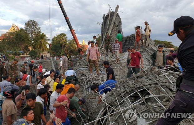 캄보디아 사찰 건물 붕괴 사고 현장 (프놈펜 신화=) 캄보디아 북서부 시엠레아프 주 시엠레아프 시에서 2일(현지시간) 신축 중인 사찰의 식당 건물이 붕괴한 직후 구조대원들이 출동해 희생자 수색작업을 벌이고 있습니다.