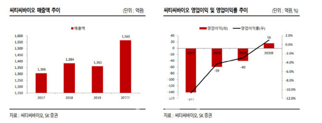 씨티씨바이오 의 2020년 연결 기준 매출은 전년 대비 15% 증가한 1565억원, 영업이익은 흑자전환한 16억원이 될 것으로 봤습니다.연구개발 기대감도 있습니다.