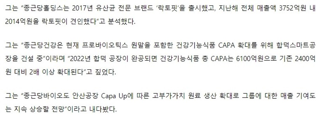 이데일리 조용석 유안타증권(003470) 은 31일 종근당홀딩스(001630) 에 대해 비상장 자회사인 종근당건강의 건강기능식품(건기식) 매출이 향후 기업의 실적에 중요한 영향을 미칠 것으로 봤습니다.